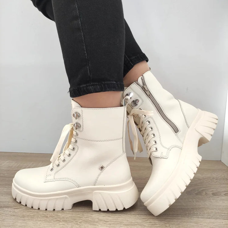 Descriere: Ghete casual în nuanță crem, confecționate din piele naturală și piele ecologică, cu un design modern și îndrăzneț. Talpa robustă și șireturile adaugă un stil distinctiv, în timp ce fermoarul lateral permite o încălțare ușoară și rapidă, făcând aceste ghete ideale pentru zilele reci de toamnă și iarnă.
