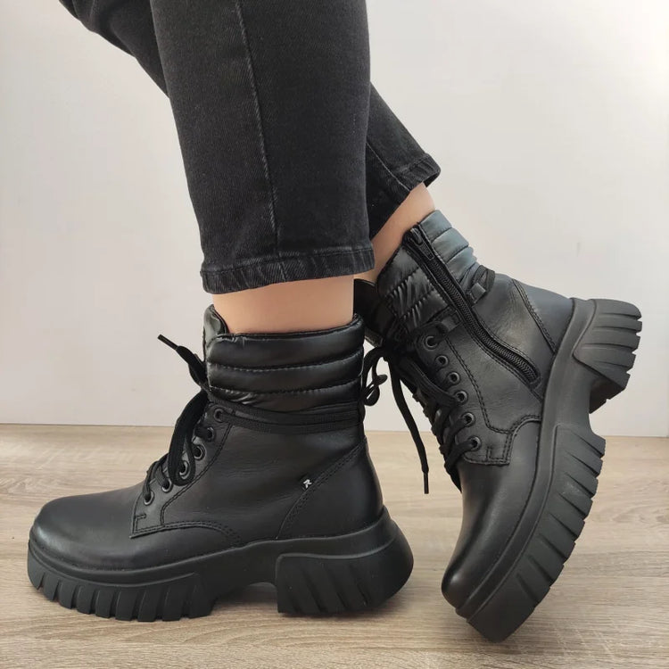 Descriere: Ghete casual de damă Rieker, realizate dintr-o combinație de piele naturală și piele ecologică, ideale pentru un stil modern și îndrăzneț. Culoarea neagră și detaliile matlasate adaugă o notă de eleganță, iar talpa groasă asigură un confort sporit în sezonul rece. Închiderea laterală cu fermoar facilitează încălțarea, completată de șireturi pentru un plus de ajustare.