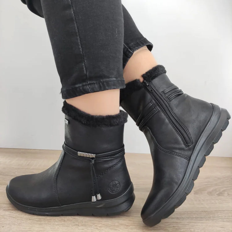 Descriere: Ghete casual din piele ecologică, de culoare neagră, cu un design modern și confortabil, ideale pentru sezonul rece. Aceste ghete au un guler îmblănit pentru un plus de căldură și confort, iar detaliile metalice adaugă un accent elegant. Sunt prevăzute cu fermoar lateral pentru o încălțare ușoară.
