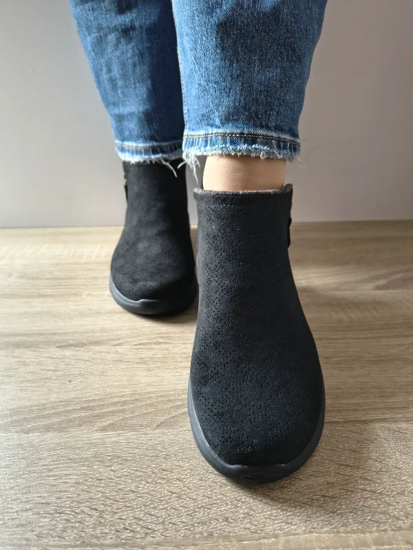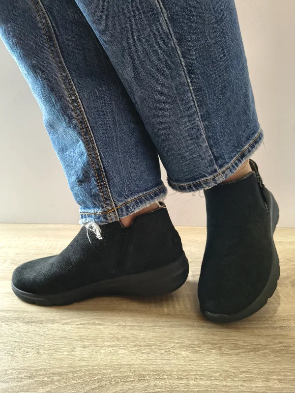 Ghetele Skechers Goga Mat în nuanță de negru sunt concepute pentru confort și funcționalitate în sezonul rece. Realizate din piele naturală întoarsă, oferă un aspect elegant și o rezistență excelentă la purtare zilnică. Talpa ușoară, cu tehnologia Air-Cooled Goga Mat, asigură amortizare reactivă și confort la fiecare pas, iar tratamentul Scotchgard protejează materialul de umezeală și pete. Închiderea laterală cu fermoar permite o încălțare rapidă și comodă.