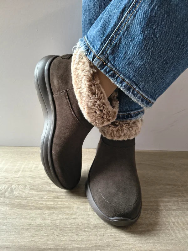 Ghetele Skechers Goga Mat în nuanță de maro velur oferă un confort excepțional și un design simplu, ușor de asortat. Realizate din piele naturală întoarsă, sunt moi și plăcute la atingere, potrivite pentru purtare zilnică în sezonul rece. Talpa ușoară și flexibilă este dotată cu tehnologia Air-Cooled Goga Mat, care asigură amortizare reactivă și confort la fiecare pas. Designul slip-on permite încălțarea rapidă, fără șireturi.