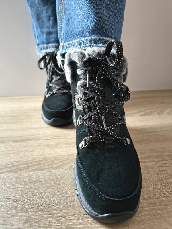 Ghetele Skechers în nuanță de negru aduc combinația ideală între confort, rezistență și design practic. Realizate din piele naturală întoarsă și piele ecologică, oferă protecție și flexibilitate, iar tehnologia 100% Waterproof menține picioarele uscate indiferent de vreme. Talpa ergonomică și tălpicul cu Memory Foam asigură confort pe tot parcursul zilei, iar sistemul cu șireturi oferă o fixare sigură și stabilitate sporită.