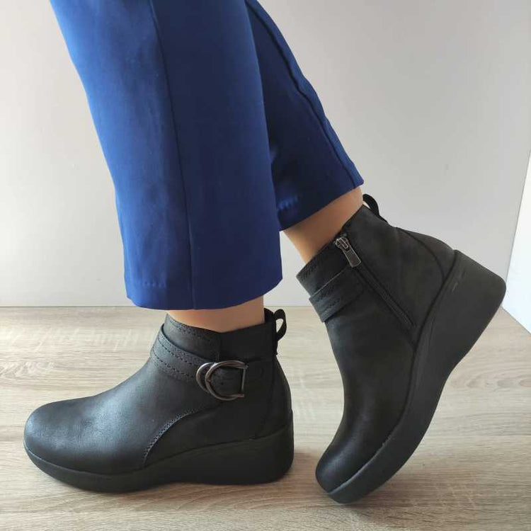 Aceste ghete casual pentru damă Skechers, model 167915/BBK, sunt alegerea perfectă pentru un look modern și confortabil. Construcția din piele ecologică oferă un aspect elegant, iar sistemul de închidere cu fermoar facilitează încălțarea. Detaliul decorativ cu cataramă adaugă un plus de stil, iar talpa înaltă de 5.5 cm asigură un confort sporit. Culoarea negru le face ușor de asortat la orice ținută casual.