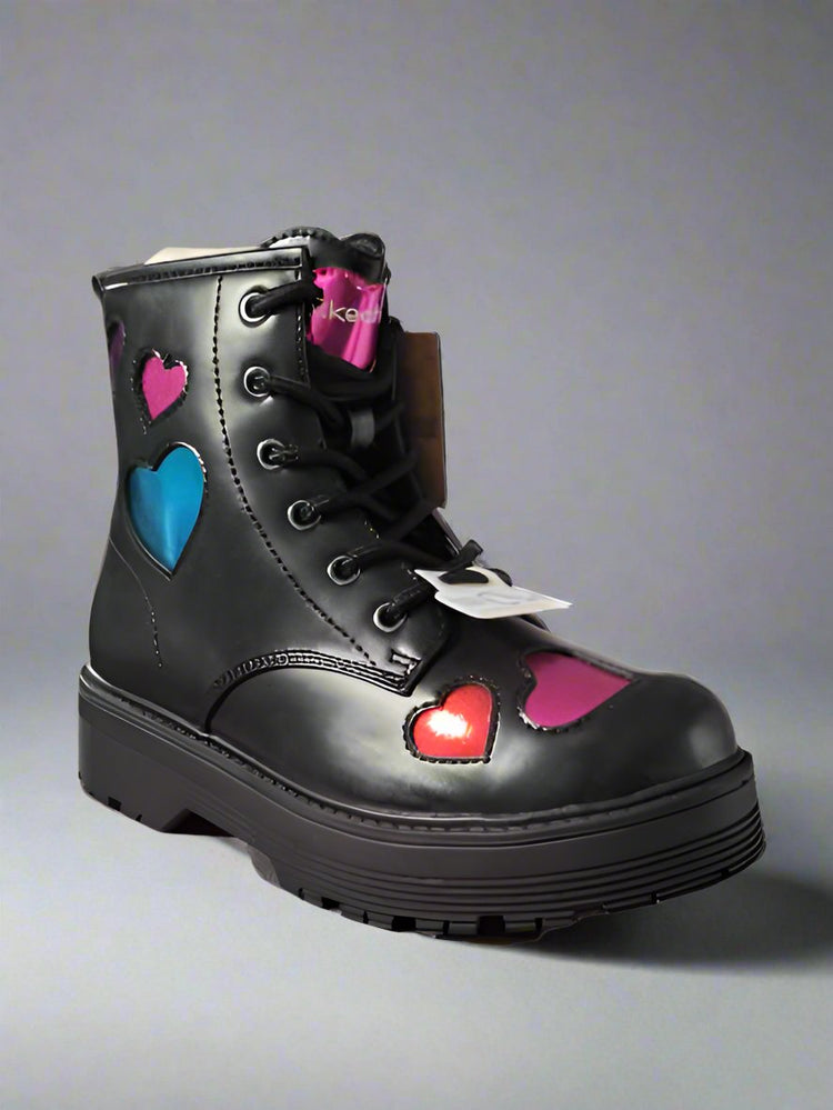 Ghete casual pentru copii de la Skechers, modelul 303409L, ideale pentru o ținută modernă și distractivă. Realizate din piele ecologică de înaltă calitate, în culoarea negru, cu detalii decorative colorate în formă de inimi, aceste ghete adaugă un plus de stil și veselie. Tocul gros de 4 cm și talpa robustă oferă confort și stabilitate, în timp ce înălțimea ghetei de 16.5 cm asigură protecție în zilele răcoroase. Sistemul de închidere cu fermoar și șiret facilitează încălțarea și oferă o fixare sigură pe picior.