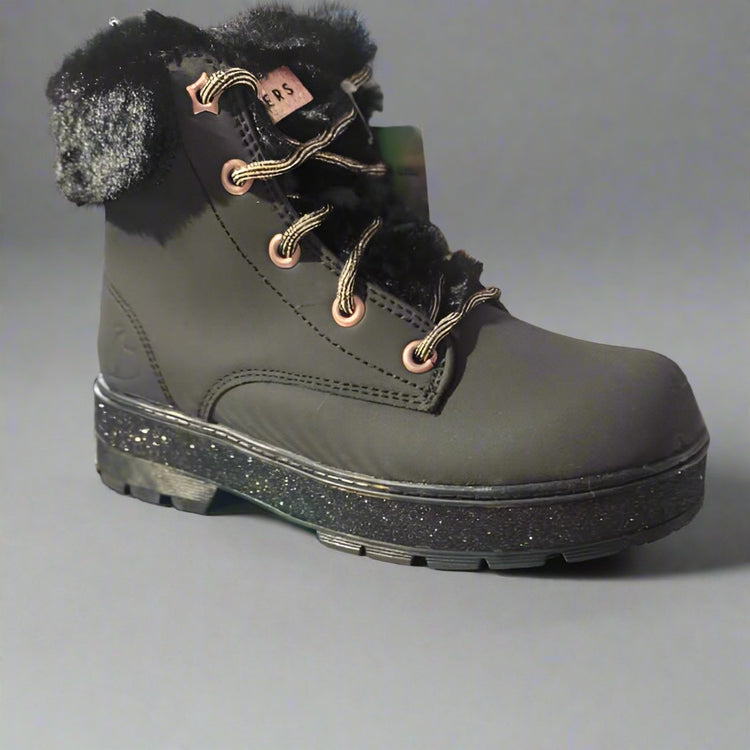 Ghete casual pentru copii de la Skechers, modelul 310952L, perfecte pentru sezonul rece datorită designului călduros și stilului modern. Confecționate din piele ecologică durabilă, aceste ghete negre se remarcă prin detaliile atractive și blănița sintetică de pe margine, oferind un aspect plăcut și confort sporit. Talpa de 3 cm este decorată cu sclipici, aducând un plus de strălucire, iar înălțimea ghetei de 14.5 cm asigură o protecție eficientă. Sistemul de închidere cu fermoar și șiret asigură o fixare facilă și sigură pe picior.