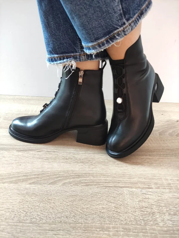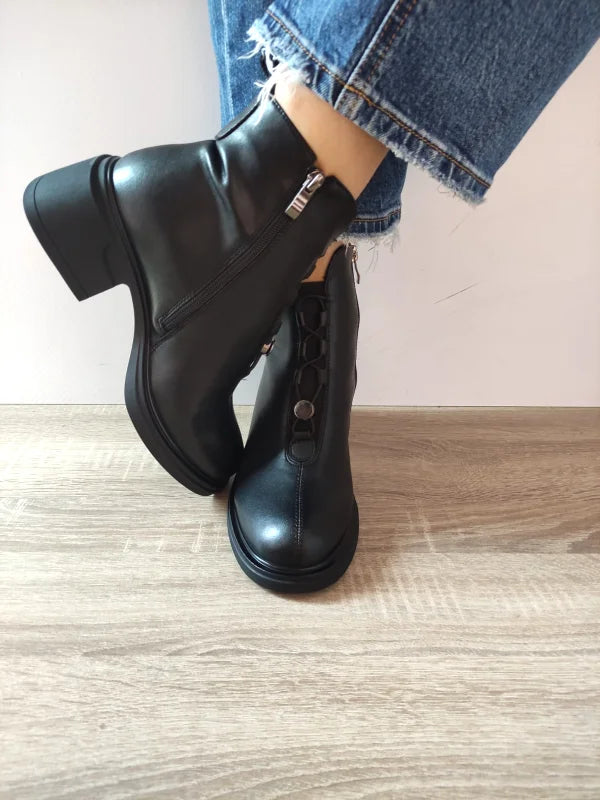 Ghete elegante din piele naturală, cu un design modern și detalii metalice subtile în zona șireturilor. Tocul robust oferă stabilitate și un plus de rafinament, iar fermoarul lateral asigură o încălțare rapidă și comodă. Silueta elegantă și finisajul impecabil le transformă într-o alegere perfectă pentru ținutele de toamnă și iarnă.