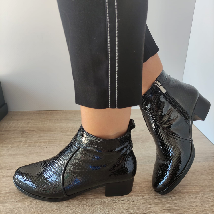 Eleganță și stil într-o încălțăminte distinctă. Ghetele DOGATI 336 pentru damă sunt confecționate din piele naturală lăcuită, oferind un aspect lucios și rafinat. Fermoarul asigură o încălțare facilă, în timp ce talpa de 3,8 cm cu toc gros promite confort și stabilitate. Perfecte pentru ocazii speciale sau ținute sofisticate, DOGATI 336 se va evidenția în orice garderobă.