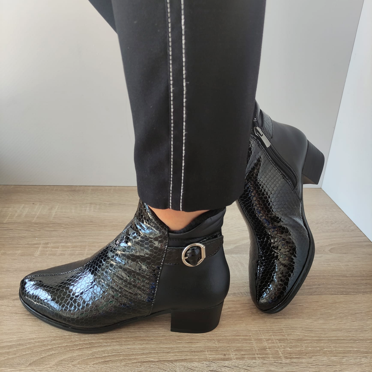 Un amestec sofisticat de piele naturală și piele lăcuită. Ghetele DOGATI 338 cu închidere fermoar și toc gros de 3,5 cm promit un echilibru între eleganță și confort. Cu o înălțime totală de 17 cm, aceste ghete adaugă o notă stilată oricărei ținute.
