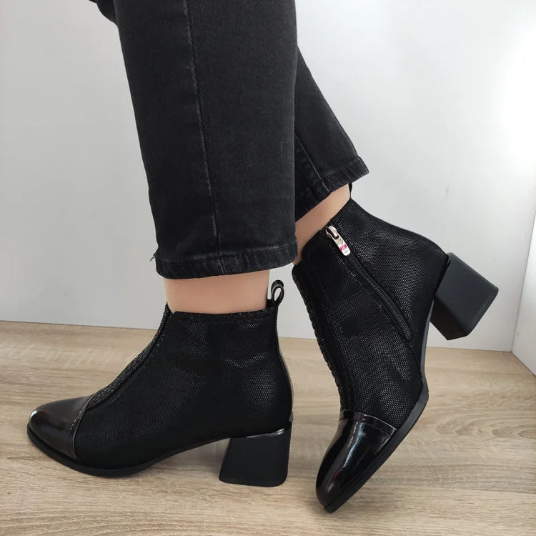 Ghete elegante din piele naturală întoarsă și lac, într-o combinație rafinată de negru velur cu accente lacuite, ideale pentru a adăuga un plus de stil ținutelor casual-elegante. Modelul prezintă fermoar lateral pentru o încălțare ușoară și un toc confortabil, perfect pentru zilele în care eleganța se îmbină cu confortul.