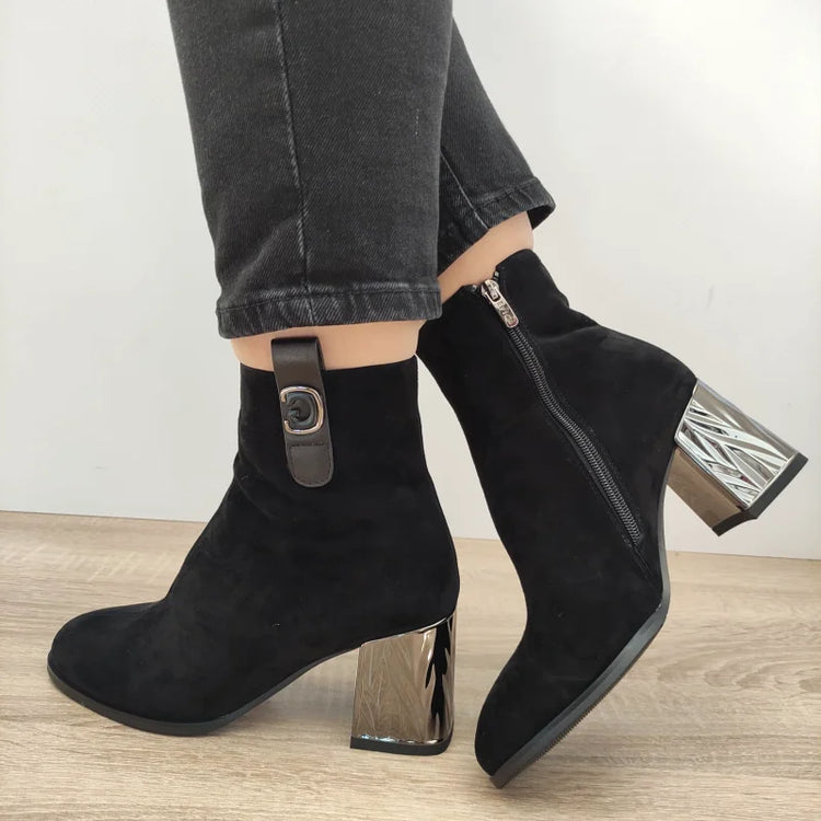 Ghete elegante din piele naturală întoarsă, de culoare negru velur, cu un toc argintiu modern ce adaugă o notă de strălucire și eleganță. Sistemul de închidere cu fermoar și detaliul decorativ pe gleznă conferă un plus de rafinament, transformând aceste ghete într-o alegere ideală pentru ocazii speciale.