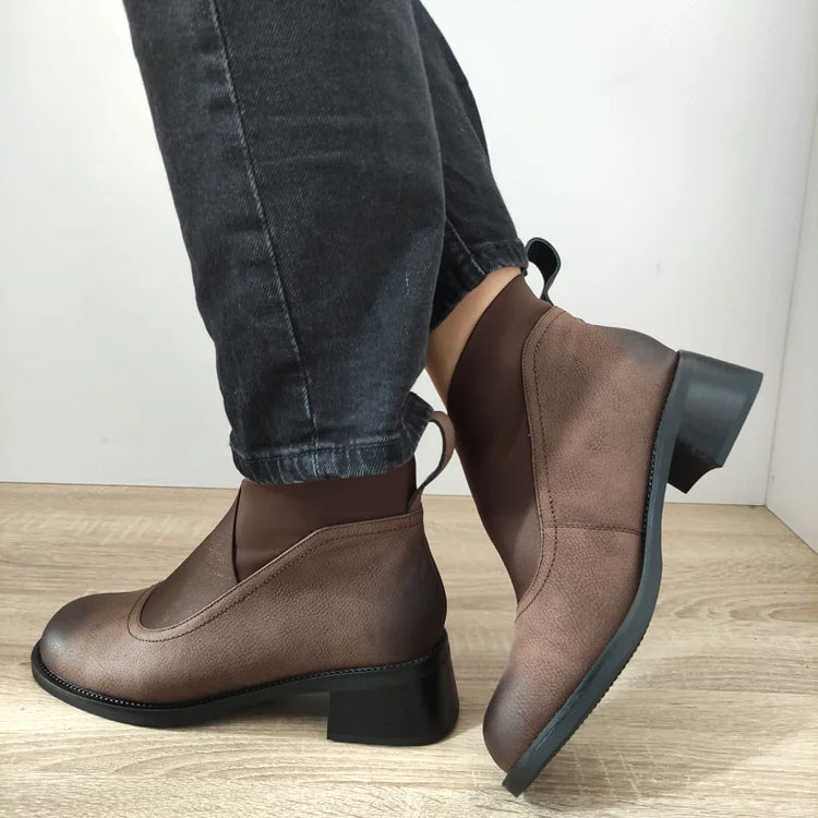 Ghete elegante din piele naturală bufo și material textil, într-o nuanță de maro coffee rafinată, ideale pentru un look modern și sofisticat. Aceste ghete sunt ușor de purtat datorită stilului slip-on, oferind confort și stil în același timp. Tocul gros și înălțimea medie adaugă un plus de eleganță și stabilitate.