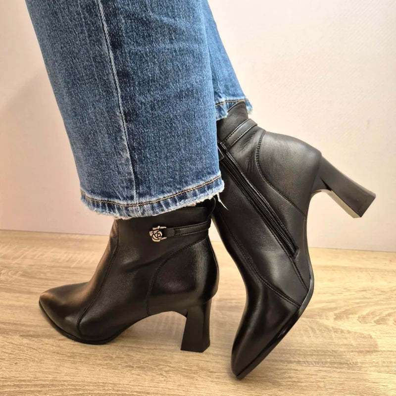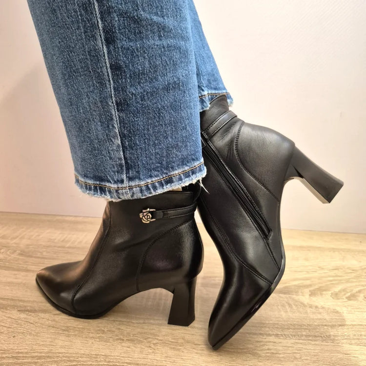Completează-ți ținutele de iarnă cu aceste ghete elegante Formazione din piele naturală, care combină rafinamentul clasic cu un detaliu modern – catarama metalică decorativă. Designul suplu și vârful ușor ascuțit oferă un aer sofisticat, în timp ce tocul de 6.5 cm adaugă înălțime și feminitate. Închiderea cu fermoar lateral asigură practicitate și confort la purtare.