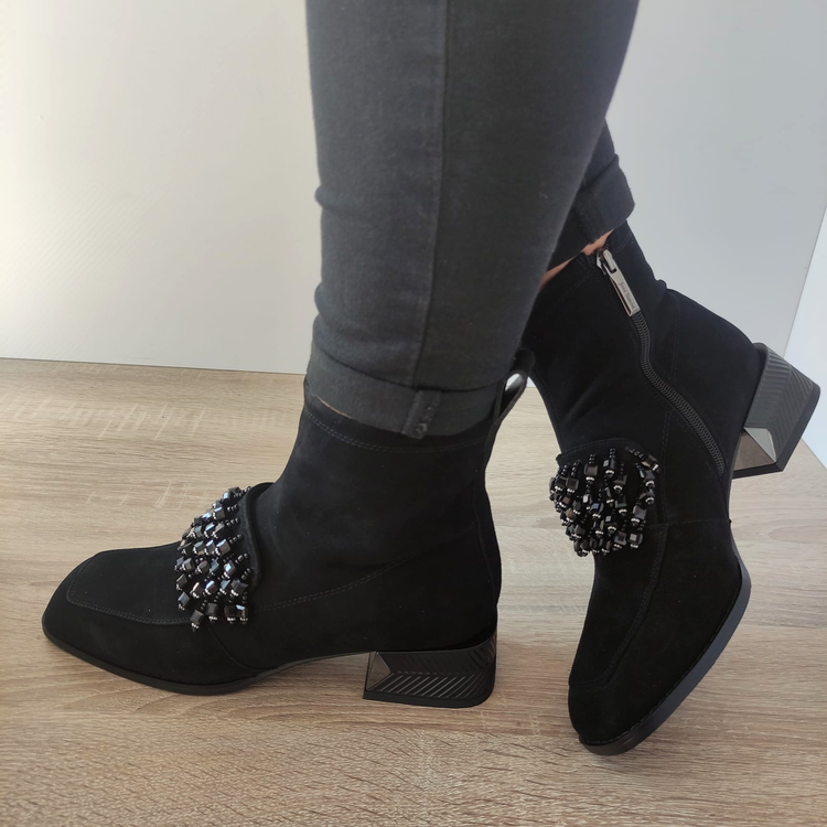 Descoperă combinația perfectă dintre eleganță și confort cu ghetetele JOSE SIMON M12-02. Realizate din piele naturală întoarsă, aceste ghete elegante pentru damă se închid rapid datorită fermoarului integrat. Tocul gros de 4,2 cm asigură stabilitate, iar înălțimea de 19,5 cm le face perfecte pentru orice ocazie specială. Cu JOSE SIMON, fiecare pas este unul stilat.