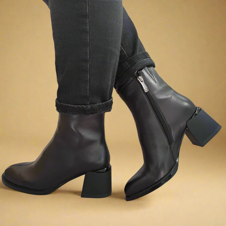 Descriere: Ghete elegante de damă Karisma, confecționate din piele naturală de calitate superioară, într-o nuanță clasică de negru. Aceste ghete se remarcă prin designul elegant și tocul gros de 6.5 cm, care oferă atât stil, cât și stabilitate. Închiderea cu fermoar facilitează încălțarea rapidă, iar silueta modernă le face ideale pentru a completa orice ținută elegantă de sezon.