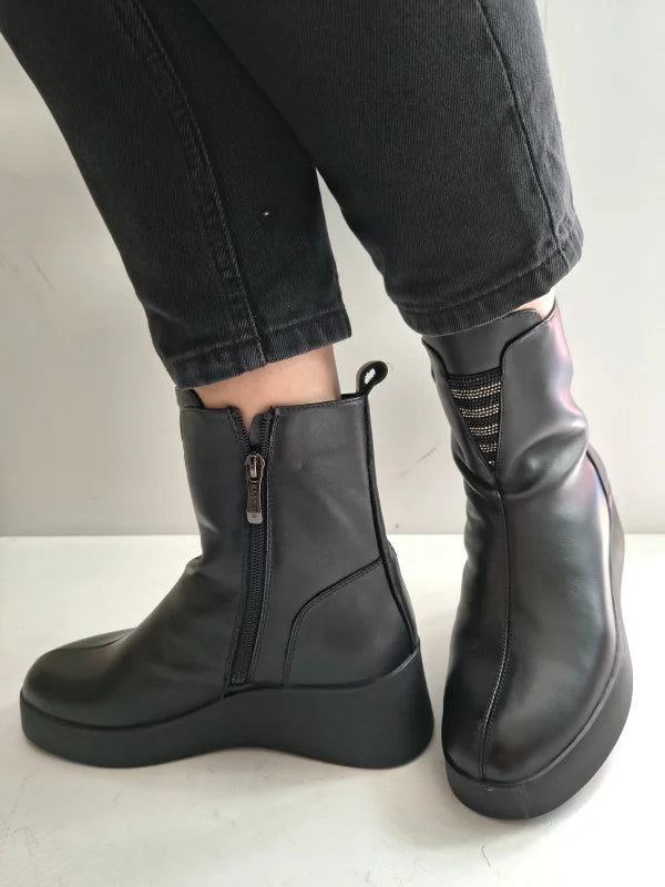 Ghete elegante și moderne, realizate din piele naturală moale, cu o talpă înaltă și comodă. Designul minimalist este completat de inserția decorativă discretă din partea din spate, care adaugă o notă de originalitate. Fermoarul lateral facilitează încălțarea rapidă, iar talpa ușor înălțată oferă stabilitate și confort pe durata întregii zile.