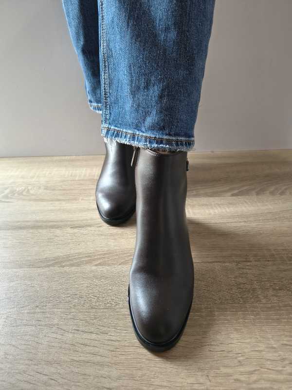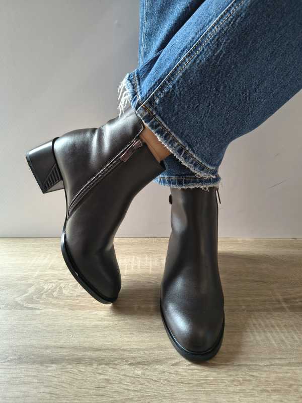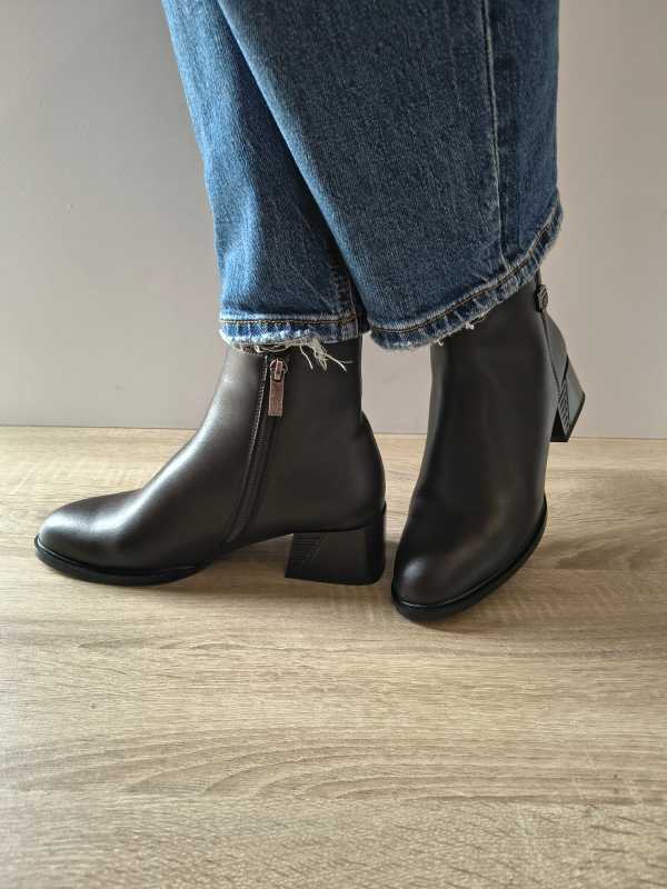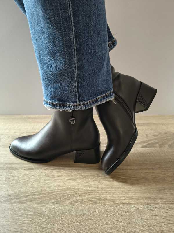 Ghete elegante din piele naturală, într-o nuanță rafinată de maro închis, potrivite pentru ținutele de zi cu zi sau pentru birou. Designul clasic este completat de detaliul discret metalic în partea superioară și de tocul mic, stabil, care oferă confort la purtare. Fermoarul lateral permite o încălțare rapidă și practică, păstrând totodată un aspect elegant.