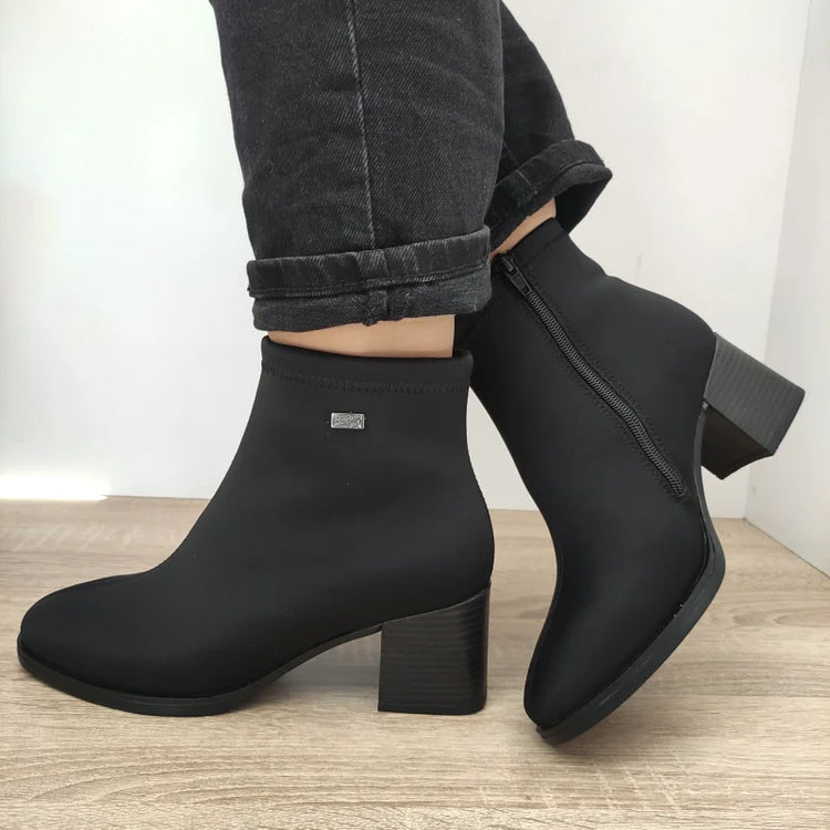 Ghete elegante de damă din material textil stretch de la Remonte, perfecte pentru un look modern și confortabil în sezonul rece. Modelul se mulează ușor pe picior, oferind un confort sporit, iar fermoarul lateral permite o încălțare rapidă și ușoară. Tocul înalt adaugă eleganță și stil fiecărei ținute.