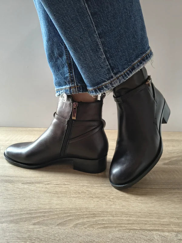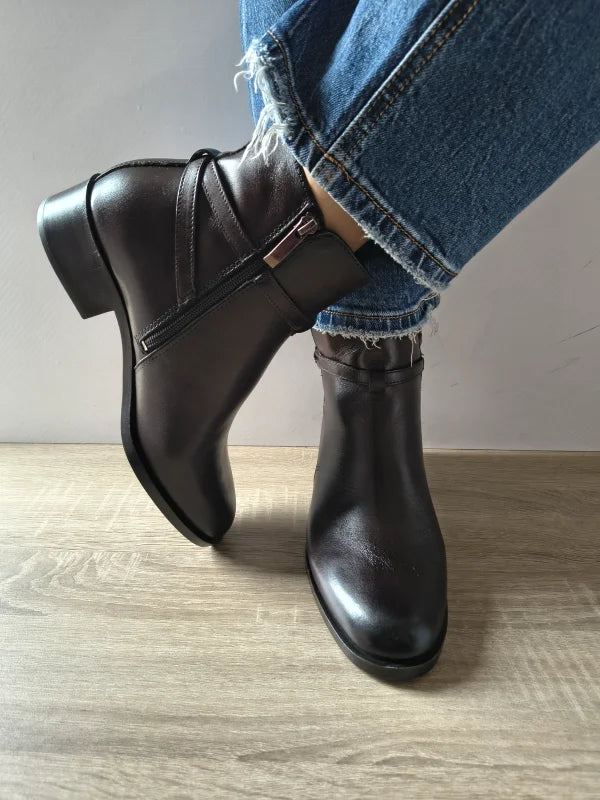 Un model elegant și rafinat, realizat din piele naturală de tip florantic, cu o textură fină și luciu discret. Culoarea maro mahogany adaugă un plus de rafinament, potrivindu-se perfect ținutelor de sezon. Fermoarul lateral permite o încălțare rapidă, iar tocul jos oferă confort la purtare pe durata întregii zile.