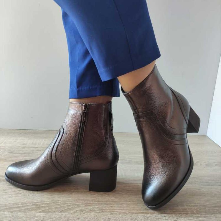 Material exterior: Piele naturală Înălțimea totală a pantofului: 20.5 centimetri Înălțimea talpii (partea din spate): 6 centimetri Sistem de închidere: Fermoar Culoare: Maro bronze Model: Ghete elegante damă Cod produs: 85309-43