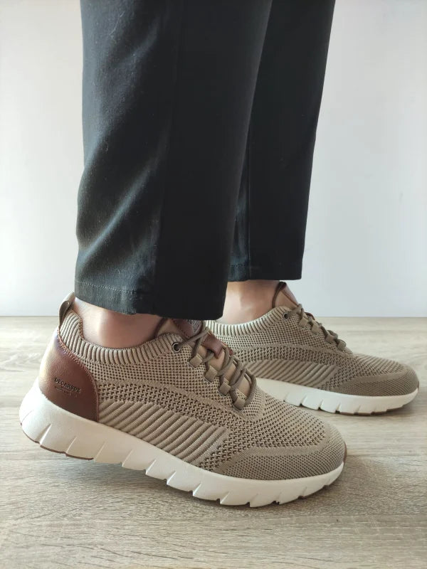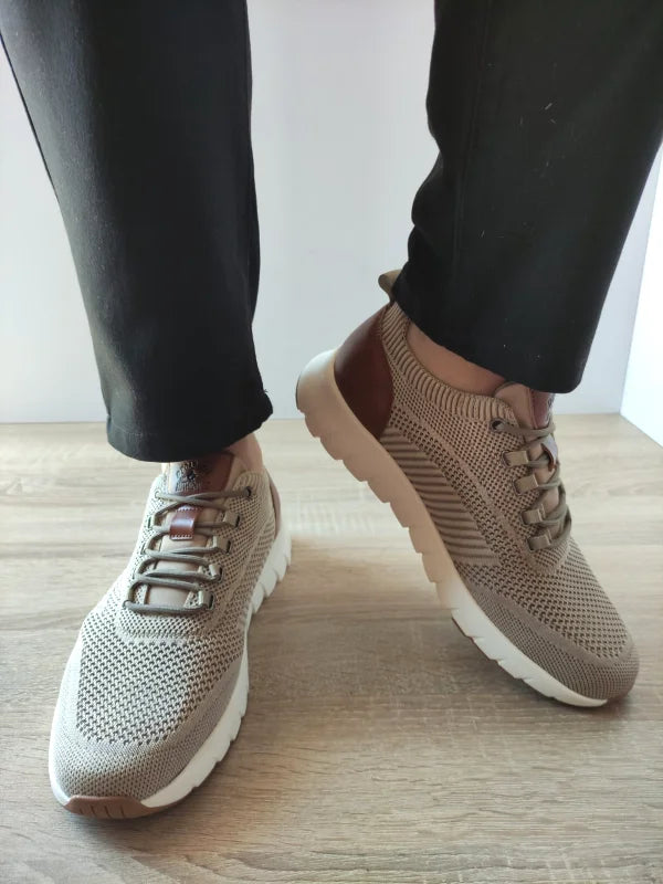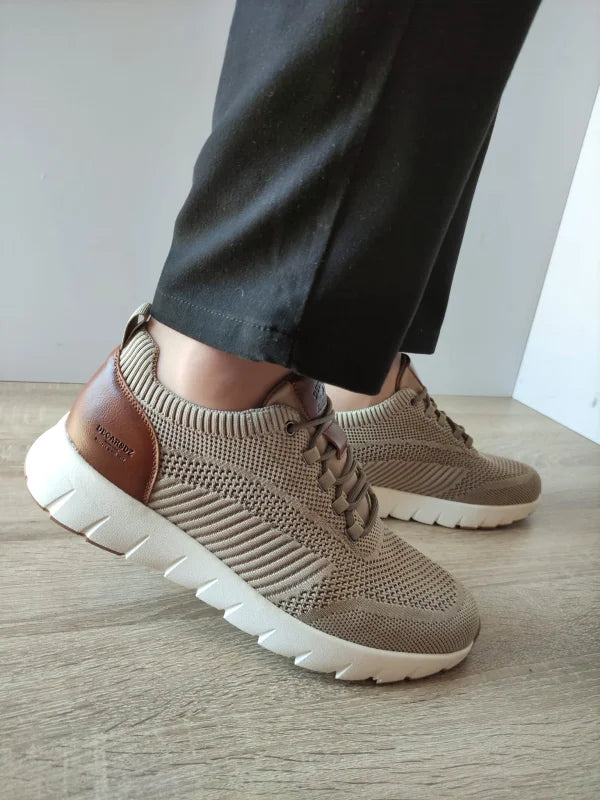 Pantofii casual DECAR Y238 în nuanță bej sunt alegerea perfectă pentru bărbații care caută o încălțăminte ușoară, respirabilă și elegantă în același timp. Realizați din material textil tricotat, acești pantofi se mulează confortabil pe picior, oferind libertate de mișcare și o ventilație excelentă. Detaliile maro de pe călcâi și limbă adaugă un plus de stil natural, iar talpa albă groasă completează lookul modern.