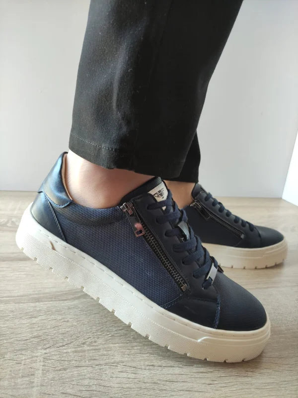 Pantofii casual GIANNI Y195 în nuanță bleumarin îmbină eleganța cromatică cu un design sport urban. Construiți din piele ecologică texturată, acești pantofi se remarcă prin fermoarele laterale decorative, ce adaugă un accent modern și practic. Talpa groasă, albă, cu profil discret, oferă confort și susținere, fiind ideală pentru mers zilnic. Contrastul subtil dintre bleumarin și alb face ca acest model să fie ușor de integrat în orice ținută casual sau smart-casual.
