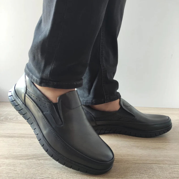 Acești pantofi casual bărbătești Goretti B64-9641 sunt concepuți din piele naturală de culoare neagră, fiind ideali pentru o ținută confortabilă și practică. Designul slip-on, cu elastic pe laterale, oferă o încălțare ușoară și un confort sporit, perfect pentru bărbații activi.