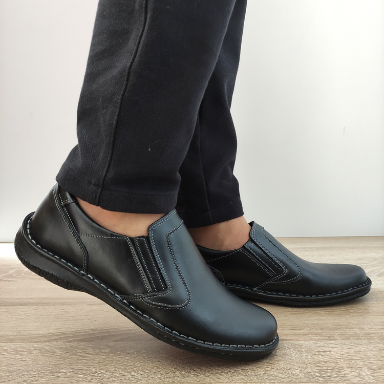 Îți prezentăm pantofii casual pentru bărbați de la Nicolis, modelul 202316, confecționați din piele naturală de înaltă calitate. Acești pantofi negri oferă un aspect modern și rafinat, fiind perfecți pentru ținutele de zi cu zi. Designul lor elegant este completat de închiderea slip-on cu elastic, asigurând o încălțare ușoară și rapidă, precum și un confort sporit. Talpa de 2.5 centimetri oferă stabilitate și susținere, în timp ce înălțimea totală a pantofului de 8.5 centimetri adaugă un plus de stil și eleganță.