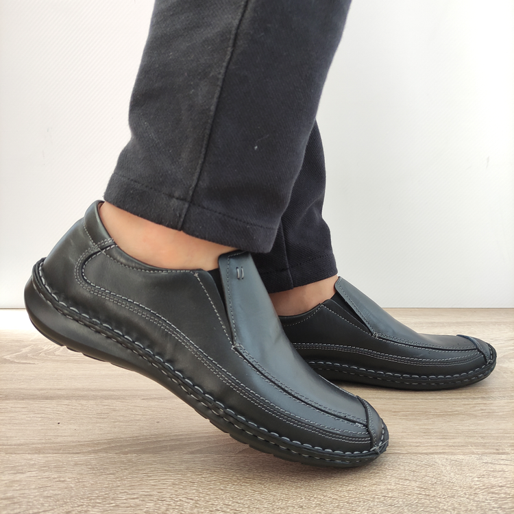 Îți prezentăm pantofii casual pentru bărbați de la Nicolis, modelul 203020, confecționați din piele naturală de înaltă calitate. Acești pantofi negri oferă un aspect modern și rafinat, fiind perfecți pentru ținutele de zi cu zi. Designul lor elegant este completat de închiderea slip-on cu elastic, asigurând o încălțare ușoară și rapidă, precum și un confort sporit. Talpa de 3 centimetri oferă stabilitate și susținere, în timp ce înălțimea totală a pantofului de 8.5 centimetri adaugă un plus de stil și eleganță.
