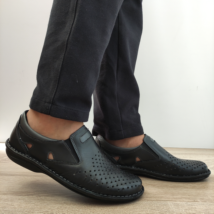 Îți prezentăm pantofii perforați casual pentru bărbați de la Nicolis, modelul 98883, confecționați din piele naturală de înaltă calitate. Acești pantofi negri sunt ideali pentru o ținută casual, oferind confort și stil. Designul perforat permite o ventilație excelentă, în timp ce sistemul de închidere slip-on cu elastic asigură o încălțare rapidă și ușoară. Talpa de 2.8 centimetri oferă stabilitate și susținere, iar înălțimea totală a pantofului de 9.5 centimetri adaugă un plus de eleganță.