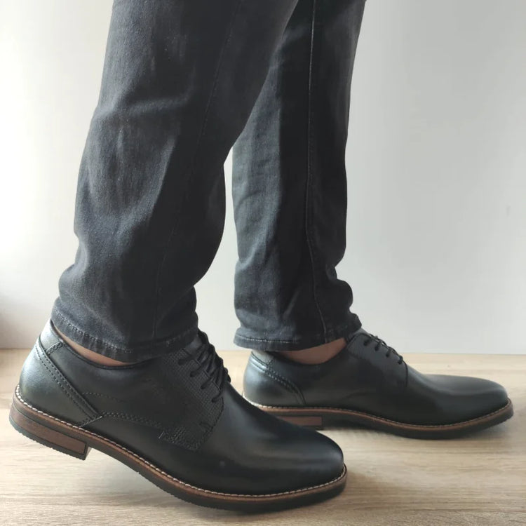Pantofi casual pentru bărbați, confecționați din combinație de piele naturală și piele ecologică, de culoare neagră, ideali pentru un stil clasic și elegant. Sistemul de șireturi asigură o fixare sigură și personalizată, iar talpa de 2.5 cm oferă confort și stabilitate pe toată durata zilei. Acești pantofi sunt perfecți pentru ținutele casual sau semi-formale, oferind un plus de rafinament.