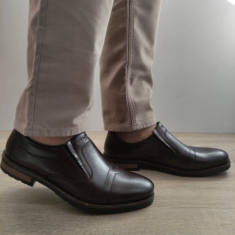 Descriere: Pantofi casual de bărbați marca Rieker, confecționați din piele naturală de calitate superioară, în nuanța maro închis. Designul slip-on cu elastic lateral asigură o încălțare ușoară și un aspect elegant, potrivit pentru orice ocazie casual. Talpa este confortabilă, oferind susținere optimă pe tot parcursul zilei.