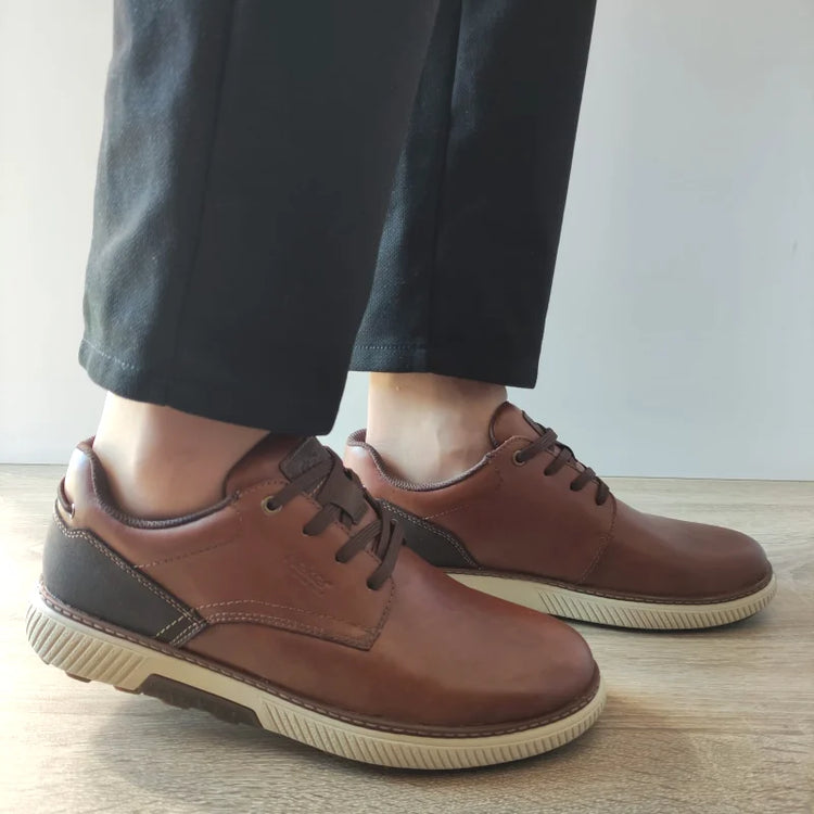Pantofi casual pentru bărbați, confecționați din piele naturală de culoare maro, ideali pentru un stil relaxat și confortabil. Sistemul de șireturi asigură o fixare sigură și personalizată, iar talpa de 2.5 cm oferă confort și stabilitate pentru activitățile zilnice. Modelul are lățimea H, fiind potrivit pentru cei care preferă un plus de spațiu și confort. Acești pantofi sunt perfecți pentru ținutele casual de zi cu zi, oferind un aspect plăcut și funcționalitate.