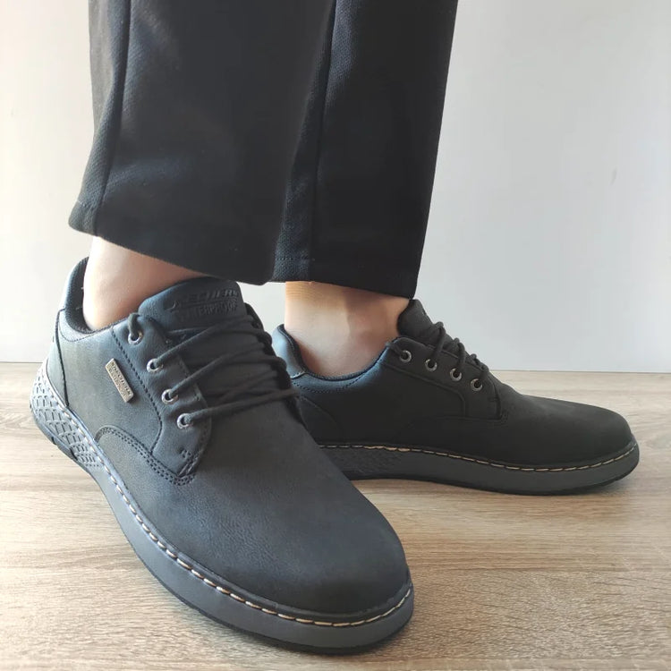 Pantofi casual pentru bărbați, confecționați din piele ecologică de culoare neagră, ideali pentru un stil modern și practic. Acești pantofi sunt 100% waterproof, oferind protecție maximă împotriva apei, perfect pentru zilele ploioase. Sistemul de șireturi asigură o fixare sigură și personalizată, iar talpa de 3 cm oferă confort și stabilitate pe tot parcursul zilei. Acești pantofi sunt potriviți pentru activitățile de zi cu zi, oferind un plus de funcționalitate și stil.