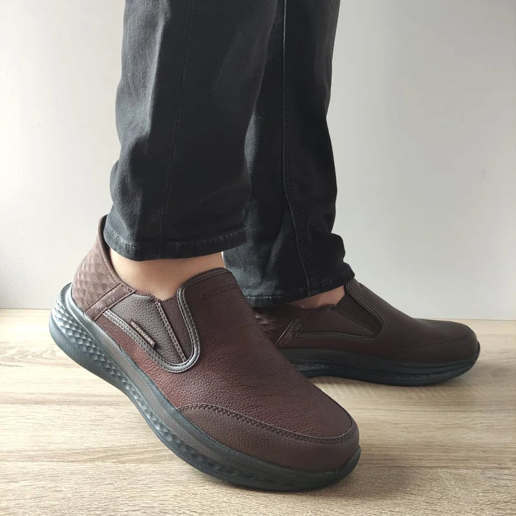Pantofi casual pentru bărbați, model Slip-ins, confecționați din piele naturală și piele ecologică de culoare maro. Acești pantofi sunt ideali pentru un stil relaxat și comod, fiind ușor de încălțat datorită designului Slip-ins. Tehnologia Air-Cooled Memory Foam asigură un confort sporit, iar talpa de 4 cm oferă stabilitate pe tot parcursul zilei. Acești pantofi sunt perfecți pentru activitățile zilnice, oferind un plus de stil și confort.