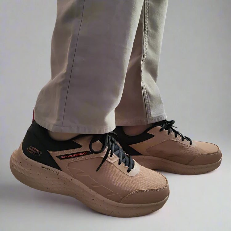 Descriere: Pantofi casual de bărbați marca Skechers, confecționați dintr-o combinație de piele naturală și material textil, în combinația de culori tan + negru. Acești pantofi sunt 100% waterproof, oferind confort și protecție în orice condiții meteo. Talpa groasă de 5 cm și sistemul de închidere cu șireturi asigură stabilitate și o potrivire ideală.