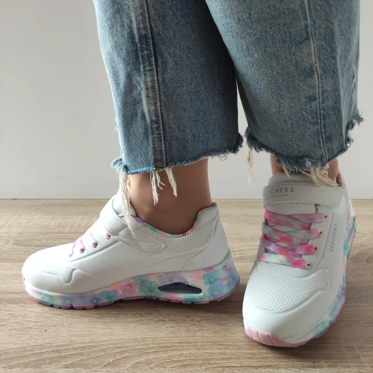 Descriere: Pantofi sport pentru copii Skechers, cu un design jucăuș și colorat, perfect pentru zilele însorite de primăvară sau vară. Construiți din piele ecologică de calitate, oferă o bună susținere a piciorului, iar sistemul de închidere cu scai (Velcro) și șireturi elastice permite încălțarea ușoară. Talpa groasă de 3,5 cm, decorată în culori pastel cu flori, adaugă un plus de stil și aderență. Interiorul căptușit și partea superioară perforată asigură un confort excelent în timpul purtării zilnice.