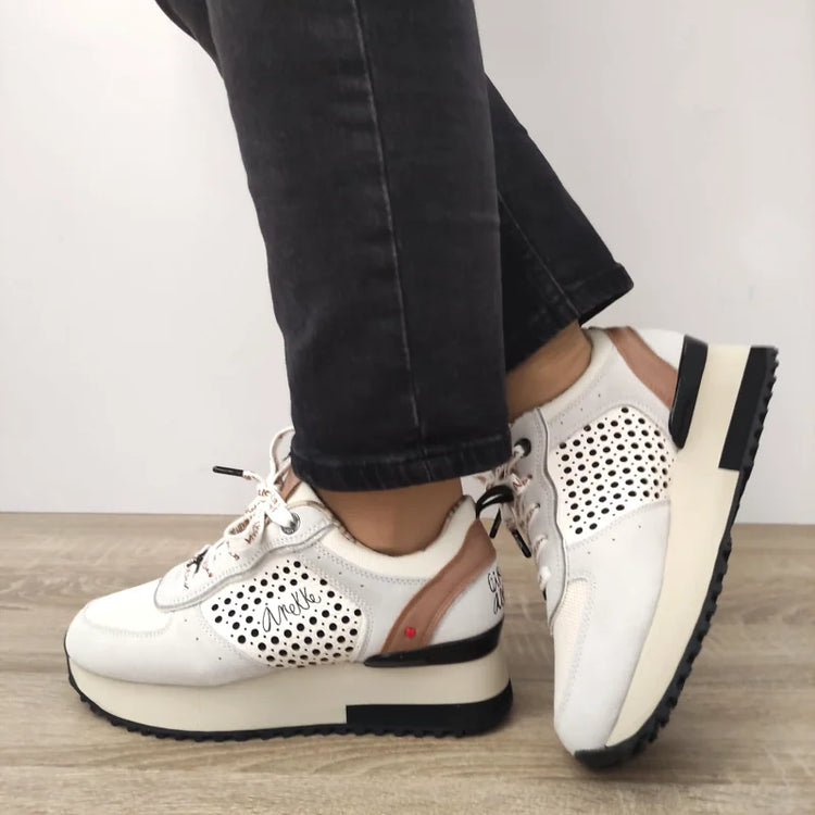 🔹 Material premium – Realizați dintr-o combinație de piele naturală, piele ecologică și material textil, acești pantofi sunt confortabili și durabili. 🔹 Design original – Perforațiile stilizate și detaliile Anekke adaugă un plus de eleganță și personalitate. 🔹 Înălțime totală de 12 cm – Oferă o potrivire excelentă și un plus de susținere. 🔹 Talpă de 4.5 cm – Asigură confort și un efect subtil de alungire a siluetei. 🔹 Închidere cu șireturi – Pentru o fixare sigură și adaptabilă. 🔹 Culoare versatilă – Alb cu accente colorate, perfectă pentru a completa ținutele casual și smart-casual.