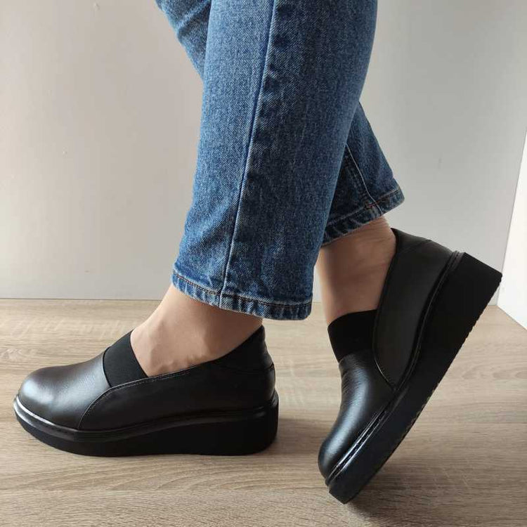 Descriere: Pantofi casual pentru femei din colecția Bio Flex, model 006-155, în culoarea negru, sunt realizați din piele naturală de înaltă calitate, oferind un aspect elegant și confortabil. Designul slip-on cu elastic facilitează încălțarea rapidă și oferă o fixare sigură pe picior. Talpa înaltă de 3,8 cm adaugă o notă modernă și susține confortul zilnic.