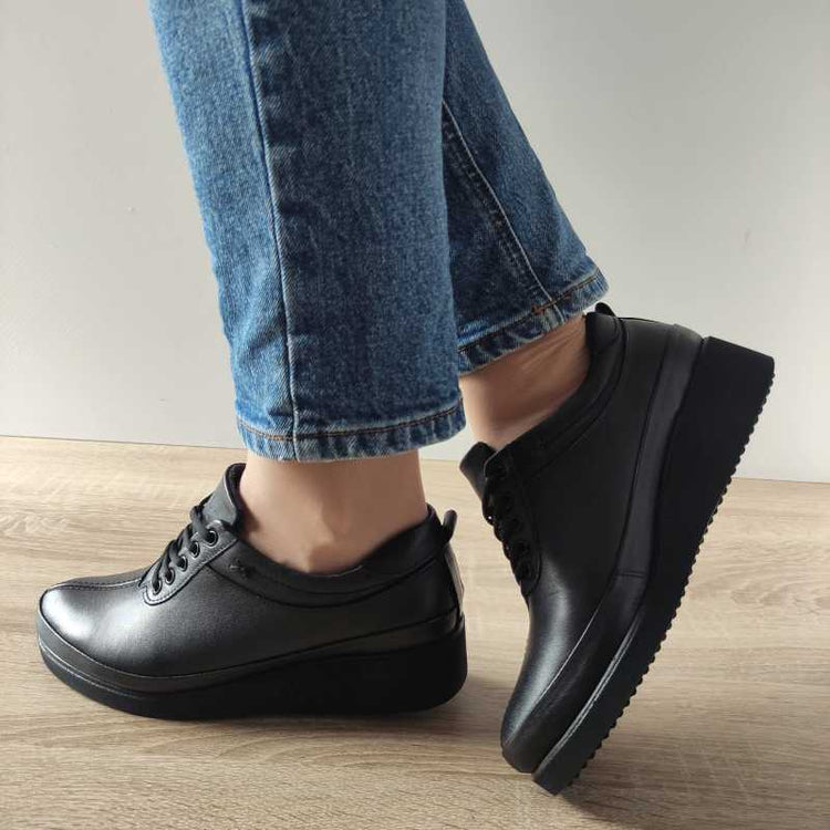 Descriere: Pantofi casual de damă confecționați din piele naturală de culoare neagră, acești pantofi oferă un design modern și simplu, perfect pentru ținutele zilnice. Talpa groasă de 3.8 cm asigură un plus de înălțime și confort la fiecare pas. Se închid cu șireturi, asigurând o potrivire reglabilă și o susținere fermă pe picior.