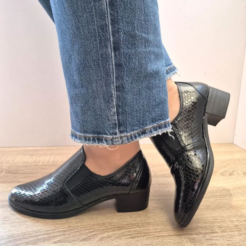 Adaugă rafinament ținutelor de zi cu zi cu acești pantofi casual Dogati, realizați din piele naturală lăcuită cu finisaj croco elegant. Designul slip-on cu inserturi elastice permite încălțarea rapidă și confortabilă, iar tocul de 4 cm îți oferă un plus de înălțime și stabilitate. Versatili și sofisticați, acești pantofi sunt ideali pentru birou, întâlniri sau plimbări, completând perfect o ținută modernă și feminină.