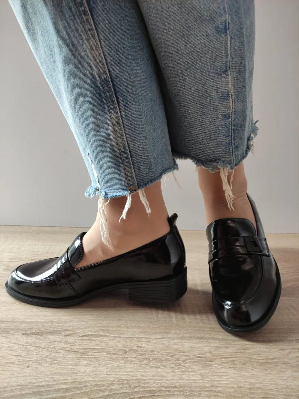 Acești pantofi casual Formazione sunt realizați din piele naturală lăcuită, având un aspect lucios și elegant. Designul tip slip-on îi face practici și ușor de purtat, în timp ce silueta clasică adaugă rafinament. Talpa comodă, cu o grosime de 3 cm în partea din spate, oferă stabilitate și susținere, iar înălțimea totală de 9.5 cm îi face ideali pentru purtarea zilnică. Culoarea negru lac îi transformă într-un model versatil, perfect atât pentru ținute casual, cât și office.