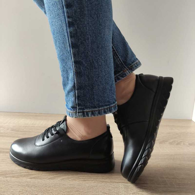 Acești pantofi casual sunt alegerea perfectă pentru femeile care doresc să îmbine confortul cu stilul. Confecționați din piele naturală de înaltă calitate, aceștia oferă durabilitate și un aspect elegant. Talpa groasă și moale asigură confort pe parcursul întregii zile, în timp ce designul simplu și modern îi face ușor de asortat la diverse ținute casual. Sistemul de închidere cu șireturi permite o fixare ajustabilă, oferind o potrivire perfectă.