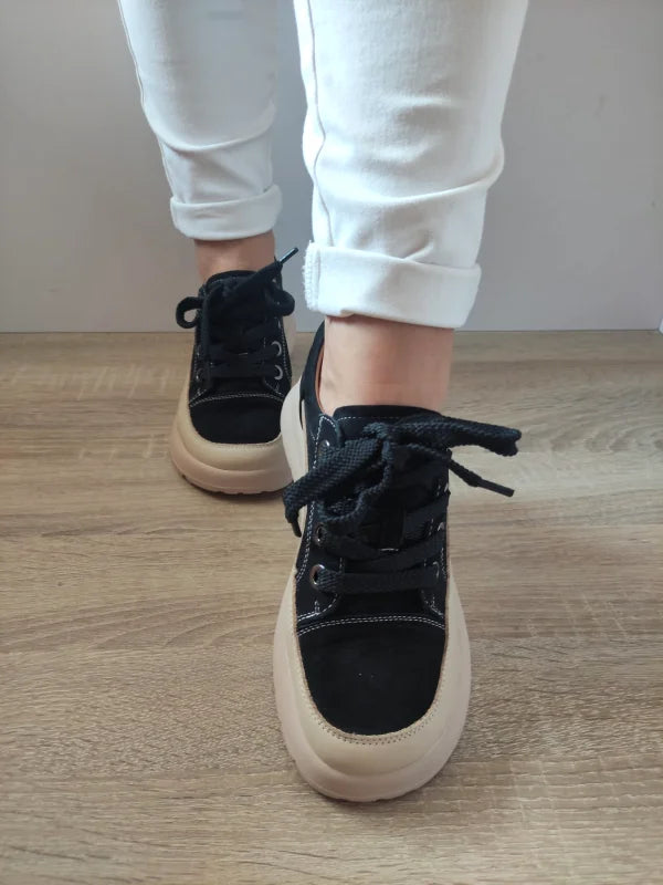 Acești pantofi casual Formazione sunt confecționați din piele naturală nubuck, oferind un aspect modern și rezistență în timp. Designul cu închidere pe șireturi asigură o fixare sigură și un plus de confort, fiind ideali pentru purtarea zilnică. Talpa groasă, cu o grosime de 3 cm în partea din spate, este ușoară și stabilă, perfectă pentru activitățile urbane. Cu o înălțime totală de 10 cm, acești pantofi se remarcă prin stilul lor sport-casual, completat de contrastul dintre nuanța clasică negru și talpa bej, care adaugă un detaliu modern și atractiv.