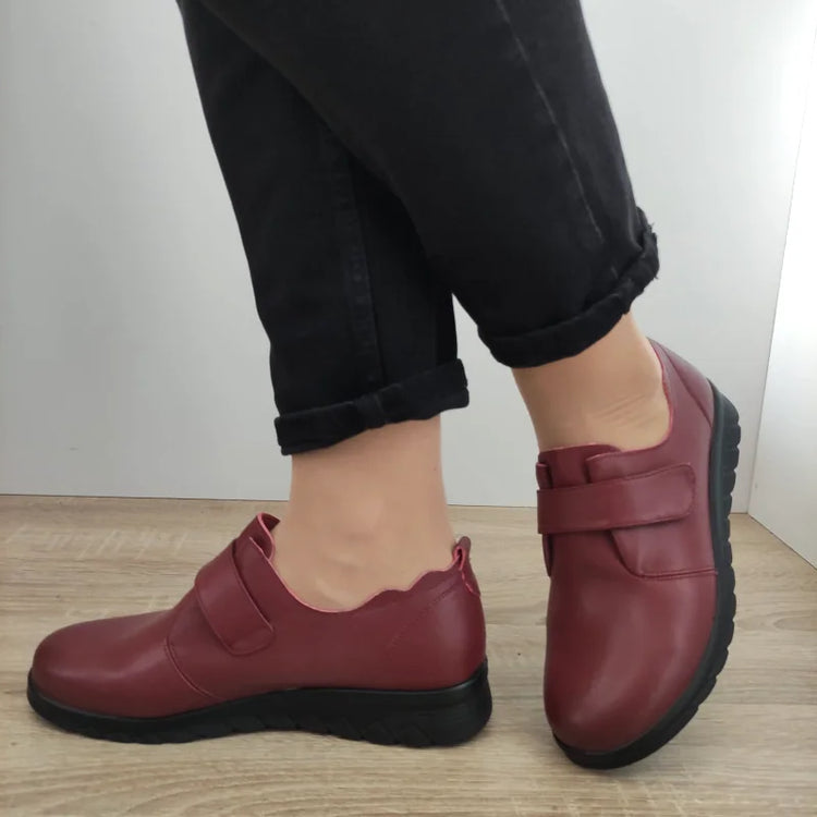 Pantofi casual pentru damă, marca Formazione, confecționați din piele naturală de culoare bordo. Acești pantofi sunt ideali pentru confortul zilnic, având un design simplu și elegant, perfect pentru diverse activități. Sistemul de închidere cu Velcro (scai) asigură o încălțare rapidă și ușoară, iar talpa de 3 cm contribuie la o bună stabilitate pe orice suprafață.