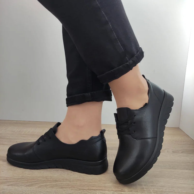 Descriere: Pantofi casual pentru damă, marca Formazione, confecționați din piele naturală de culoare neagră. Acești pantofi oferă confort pentru utilizarea zilnică, având un design simplu și elegant, perfect pentru diferite ocazii. Sistemul de închidere cu șireturi permite o ajustare precisă, iar talpa de 3 cm asigură stabilitate și susținere pe parcursul întregii zile.