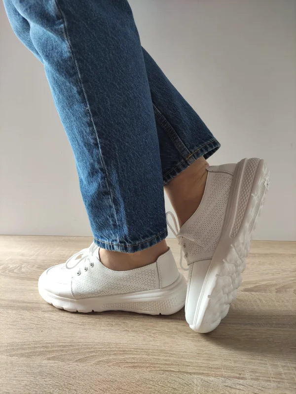Descriere: Acești pantofi albi din piele naturală de la Formazione îmbină perfect aspectul modern cu funcționalitatea. Textura perforată adaugă un plus de stil și aerisire, în timp ce talpa lată, bine conturată, oferă susținere pe tot parcursul zilei. Se potrivesc perfect în ținute lejere, casual, dar pot fi integrați ușor și într-un look semi-elegant. Sistemul clasic cu șireturi asigură fixarea ideală pe picior, iar detaliile fine scot în evidență calitatea materialului și atenția la finisaje. Sunt alegerea ideală pentru plimbări, birou sau ieșiri în oraș, fără a compromite confortul.