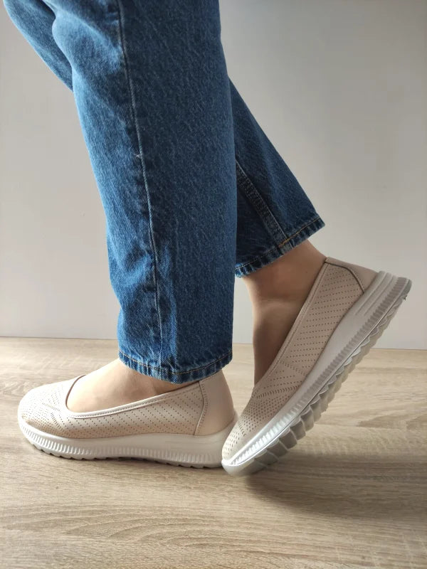 Caracteristici: Material exterior: Piele naturală Culoare: Bej Înălțime totală: 9 cm Grosimea talpii (la spate): 3 cm Stil: Pantofi casual Tip închidere: Slip-on