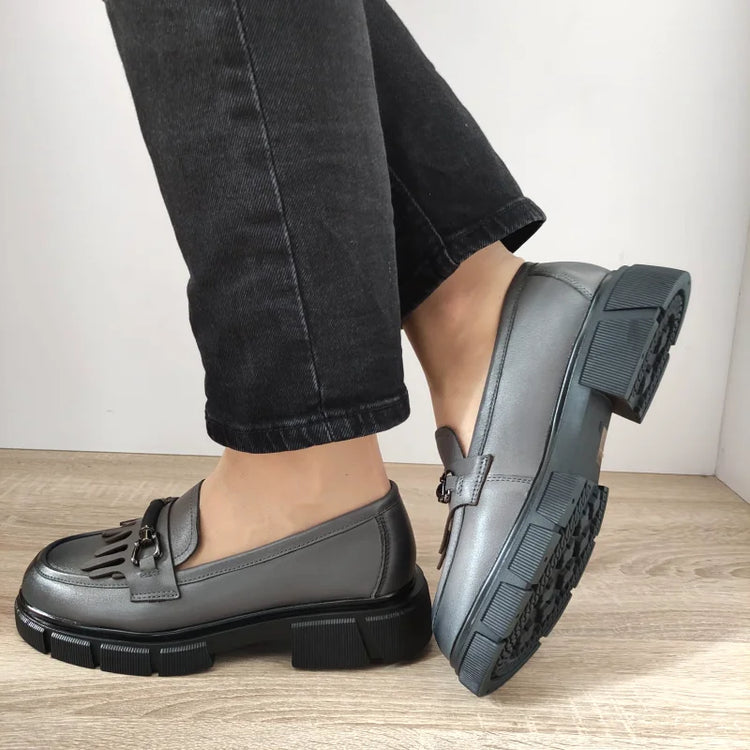 Descriere: Pantofi casual pentru damă, marca Formazione, confecționați din piele naturală de culoare gri. Aceștia sunt eleganți și confortabili, ideali pentru purtarea zilnică sau pentru completarea ținutelor smart-casual. Sistemul slip-on facilitează o încălțare rapidă și comodă, iar detaliile decorative din partea superioară adaugă un plus de rafinament. Talpa înaltă de 3.8 cm asigură confortul necesar pe tot parcursul zilei.