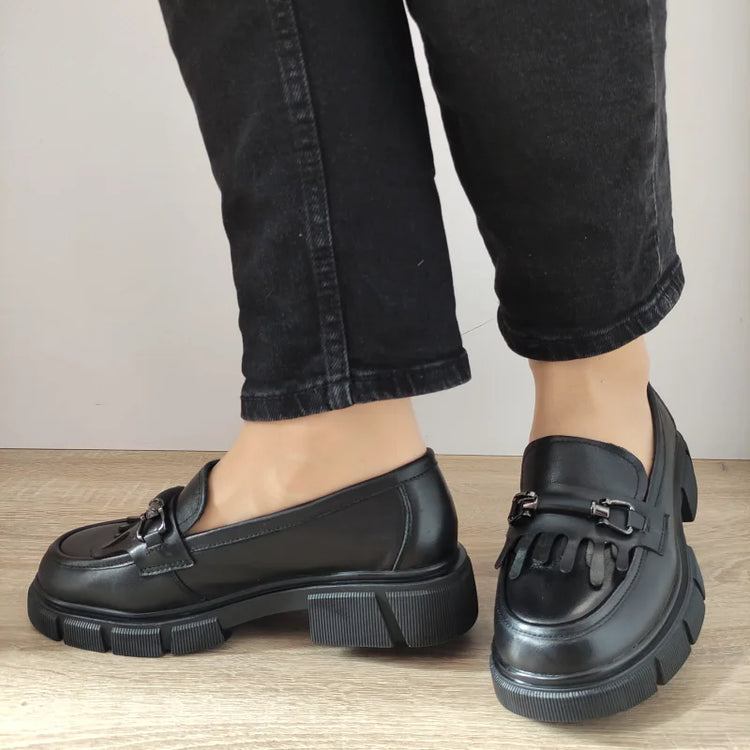 Descriere: Pantofi casual pentru damă, marca Formazione, confecționați din piele naturală de culoare neagră. Aceștia au un design modern și versatil, perfect pentru a completa diverse ținute casual sau smart-casual. Sistemul slip-on facilitează o încălțare rapidă și confortabilă, iar detaliile decorative din partea superioară conferă un plus de eleganță. Talpa de 3.8 cm asigură o înălțime confortabilă și un aspect stilat.