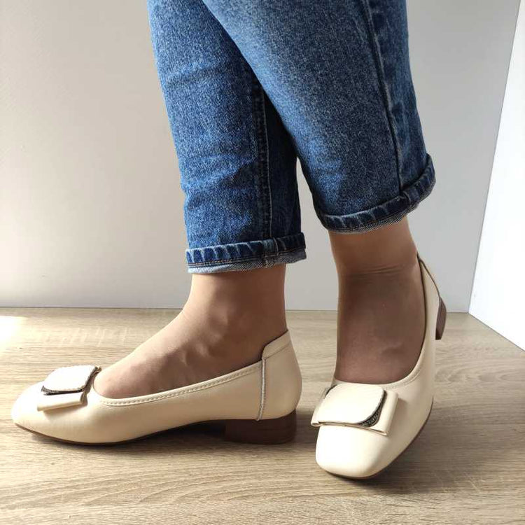 Pantofii casual damă FORMAZIONE TP5103-12 crem reprezintă alegerea perfectă pentru un look elegant și confortabil în același timp. Realizați din piele naturală de calitate superioară, acești pantofi oferă un design clasic cu detalii moderne, cum ar fi aplicația decorativă metalică pe partea din față. Înălțimea redusă a tocului de 2,2 cm asigură stabilitate și confort pe parcursul întregii zile, iar nuanța crem adaugă un plus de rafinament garderobei tale. Acești pantofi slip-on sunt ușor de încălțat și se potrivesc de minune atât la ținute casual, cât și la cele office.